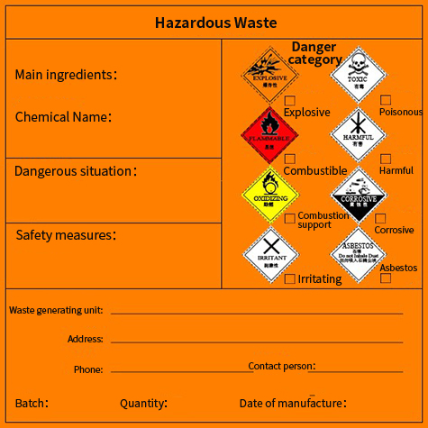 Identification tags include sticky type and hanging type. Sticky type hazardous waste labels are affixed to hazardous waste storage containers and packaging materials. Hanging type hazardous waste labels are suitable to be attached to hazardous waste storage containers and packaging materials that are not easy to stick firmly or inconvenient to stick but relatively easy to hang.